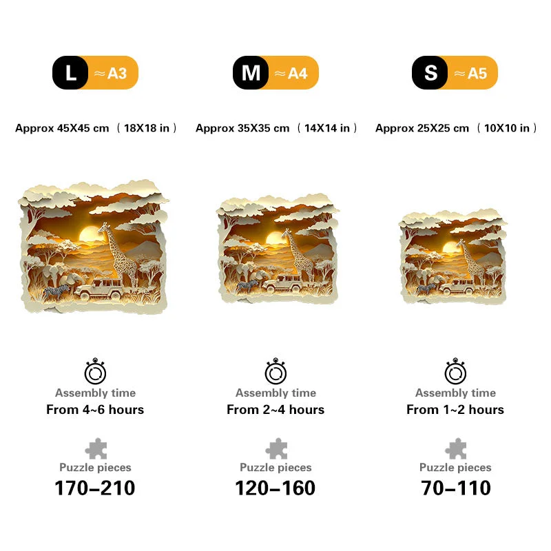 You can enjoy this nature-themed puzzle relaxing time. There are multiple sizes. Our wooden jigsaw puzzle is made of small pieces shaped like savanna animals and plants.